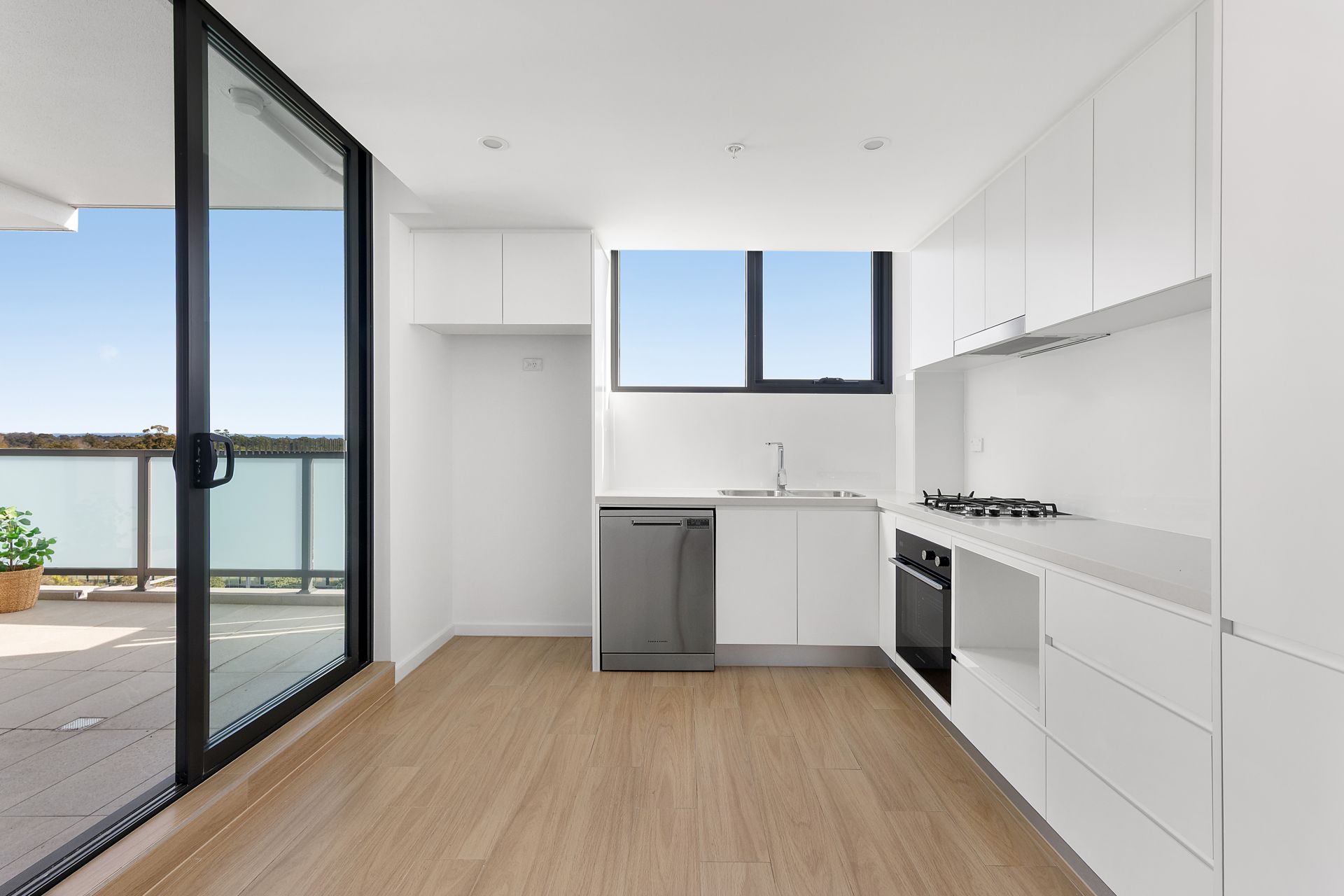 - Dishwasher, gas cooktop, oven, glass splashback