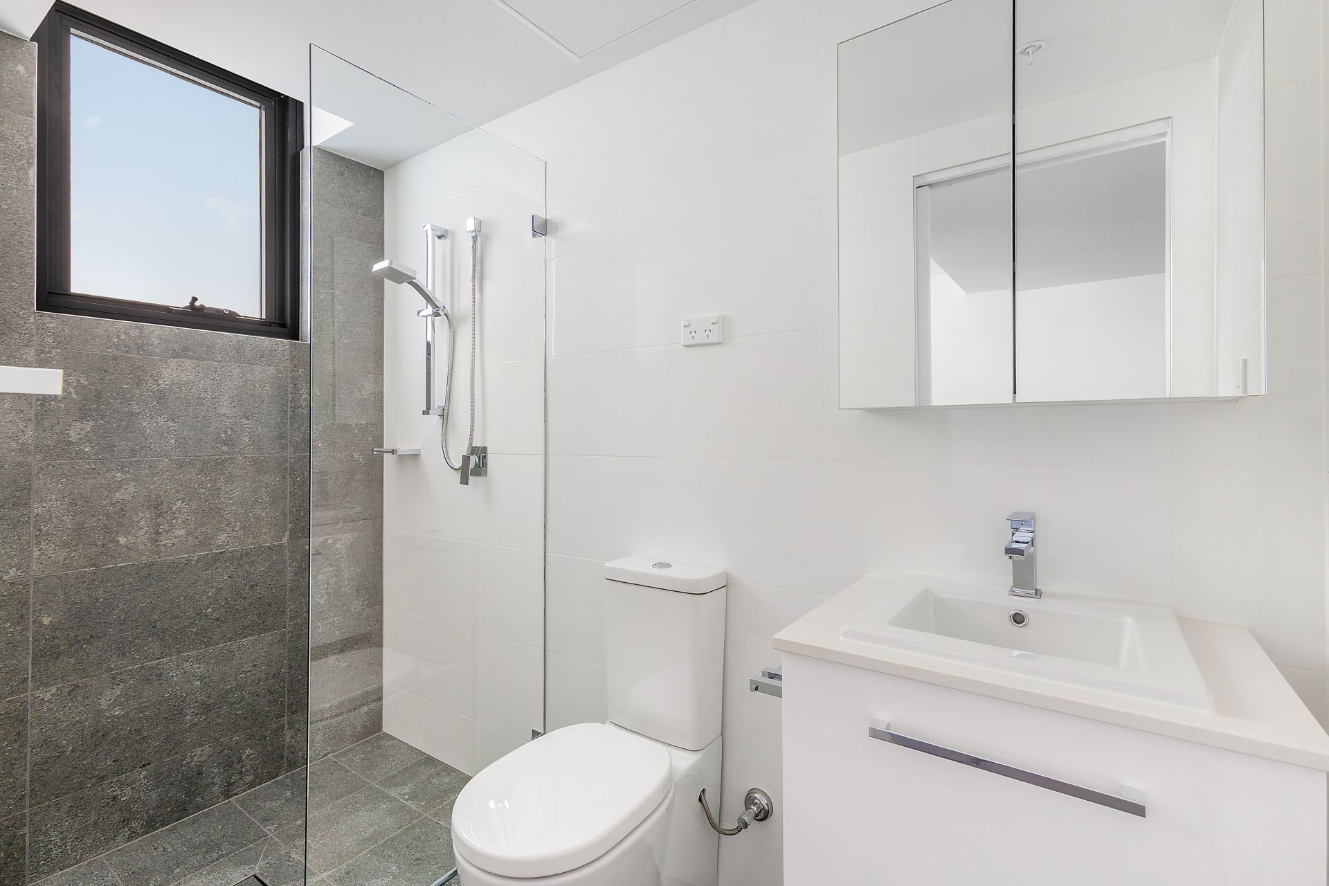 - Bathrooms with floor-to-ceiling tiles, walk-in-shower, stone-topped vanity
