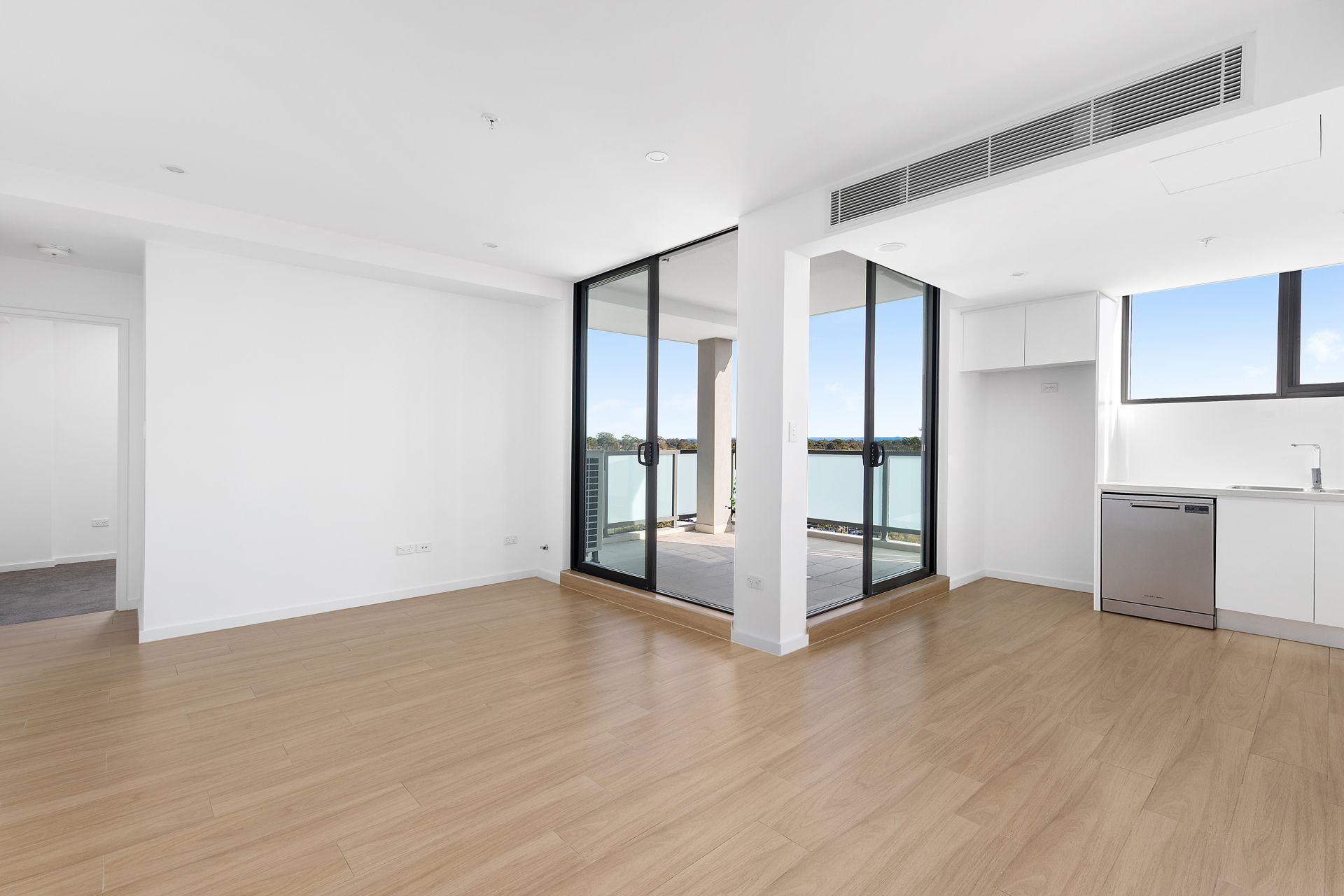 Brand New Living. Stunning leafy views from an ideal open floor plan awash with sunlight streaming through a dual set of full-height glass sliders extending out to covered outdoor living.