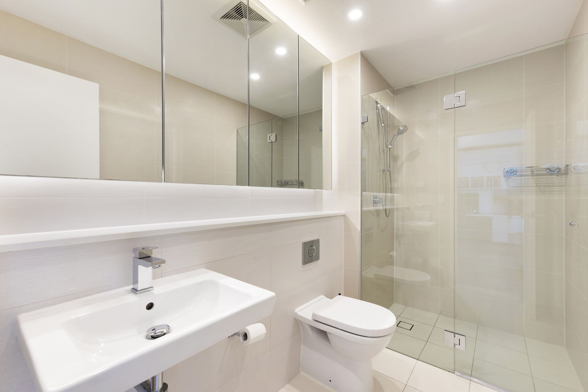 • Modern Bathroom: Floor-to-ceiling tiles, frameless shower screen, and vanity storage.