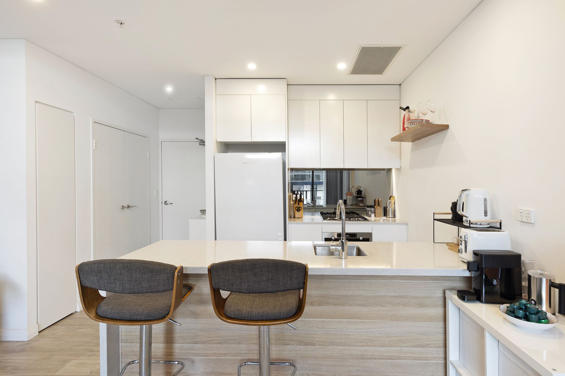 • Stylish Kitchen: Modern kitchen with stone benchtops, glass splashback, gas cooktop, dishwasher, and ample storage.